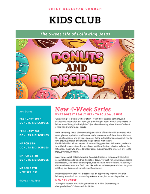 We value our Kids Ministry at a high level here at Emily Wesleyan Church. We do our best to create fun and engaging activities for kids of all ages where they can learn more about Christ and develop Christ-centered relationships all the while having fun! We do this through offering a Kids Club on Wednesday evenings, Sunday School classes, and Vacation Bible Schools that take place in the summer months.